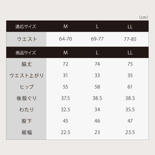 ■サイズ:M/ウエスト64-70、脇丈72、ウエスト上がり31、ヒップ55、後股ぐり37.5、わたり32.5、股下45、裾幅22.5、L/ウエスト69-77、脇丈74、ウエスト上がり33、ヒップ58、後股ぐり38.5、わたり34、股下46、裾幅23、LL/ウエスト77-85、脇丈75、ウエスト上がり35、ヒップ61、後股ぐり38.5、わたり35.5、股下47、裾幅23.5cm