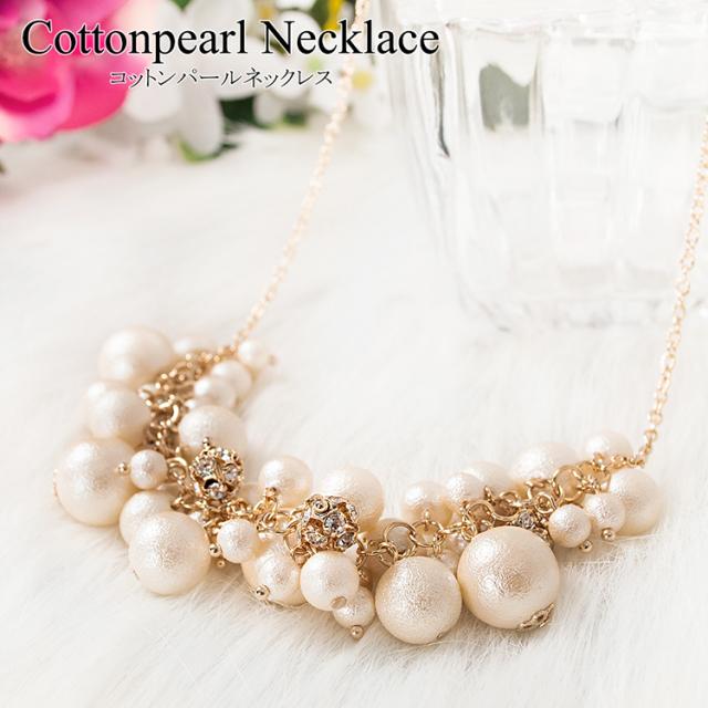 落ち着いた印象のコットンパールを大小いろいろなサイズを散りばめたボリューミーなネックレス