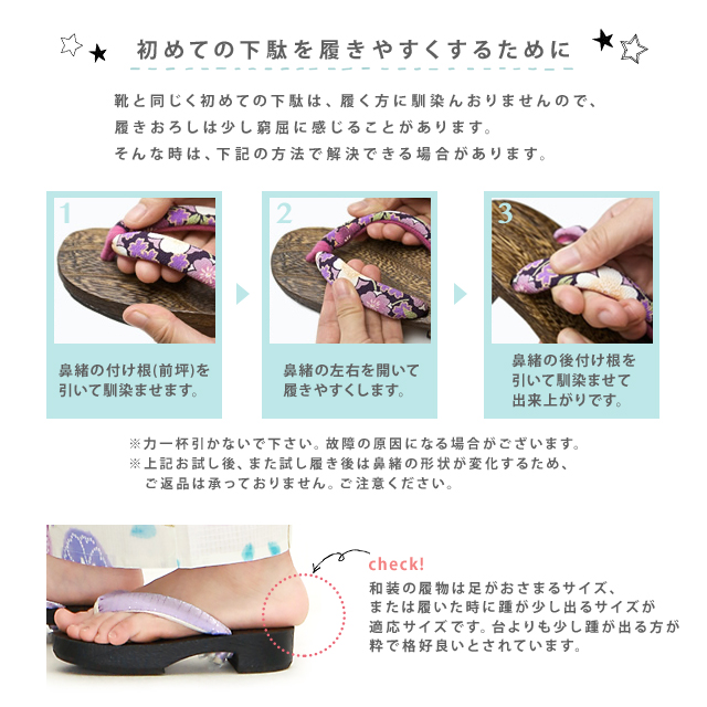 ※草履や下駄などの履物は、試し履きをされますと鼻緒の形状が変化するため、お試し後のご返品は承っておりません。ご注意ください。