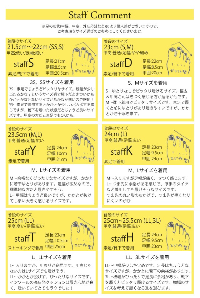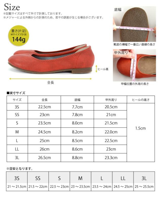 3S:21.0〜21.5cm、SS:21.5〜22.0cm、S:22.5〜23.0cm、M:23.0〜23.5cm、L:23.5〜24.0cm、LL:24.5〜25.0cm、3L:25.0〜25.5cm
