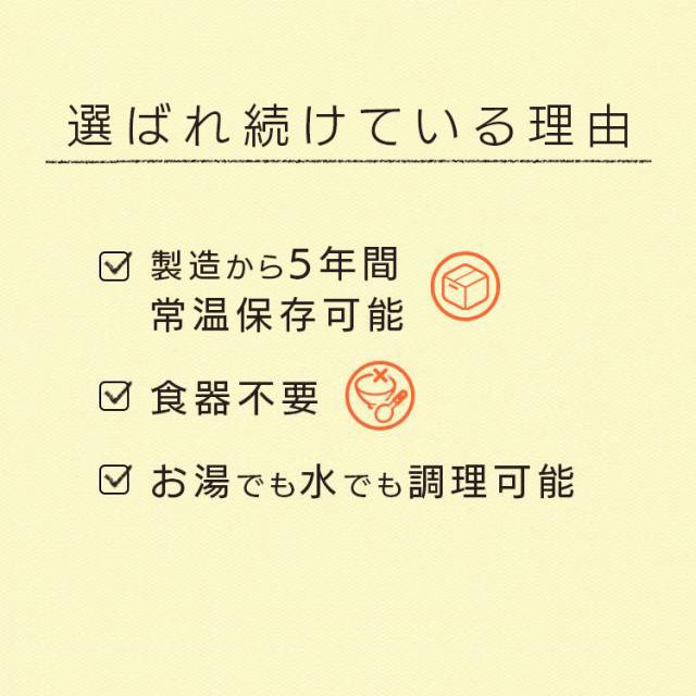 - 入れ替えのため購入しました。期限も?十分あり配送も?素早い対応でした。味はまだ食べていないのでわかりませんが、水でもお湯でも食べれるアルファ米は軽くて持ち運びにもよく、水と一緒に保管しておけば袋が容器...