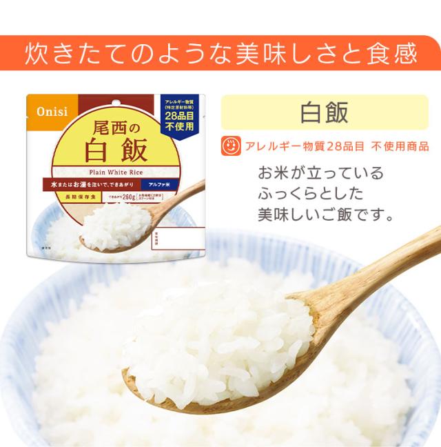 お湯を注いで15分で食べられる非常時にも心強い尾西のアルファ米!100%国産のうるち米だけを使用。お湯でも水でもたった15分でふっくらご飯が出来上がります。スプーン付きで非常時でも安心。でき上がり量はちょっと大盛り260g。市販のおにぎり(約100g)2.5個分ぐらいです。●内容量(約):100g(出来上がり量 260g)●原材料:うるち米100%●セット内容:10袋※当商品はお取り寄せ品の為、在庫の確認及び商品のお届けまでお時間を頂く場合がございます。予めご了承くださいますようお願いいたします。(検索用:災害・防災・災害用品・備蓄・非常・非常用・非難・地震・非難用品・リュック・持ち出し・袋・セット・クラッカー・ビスケット・カンパン・ようかん・スープ・お粥・米・備蓄用保存・)