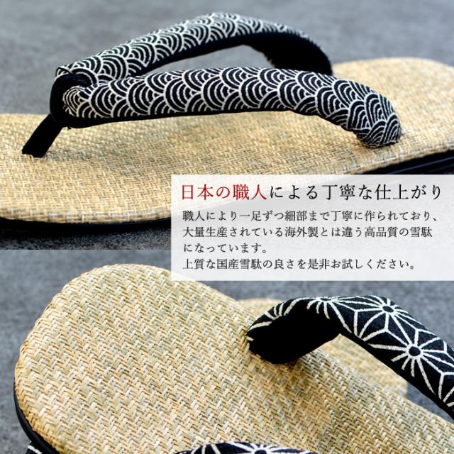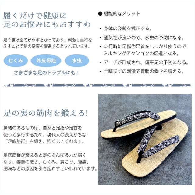 ※こちらはLLサイズ(大きめ)となります。 底面に本皮を使用した「竹春」の高級感溢れる本皮パナマ雪駄! 自然の素材を活かした「竹春」のパナマ雪駄は、天然素材独特の足ざわりが足裏から伝わってとても気持ち良い!履いていくうちにどんどん味が出てきます! 天然素材の「パナマ材」は、表面がサラッとしていて気持ち良く、足裏に熱がたまらず一年中さらっと快適です。 素足で履いてムレにくく、快適な履き心地です。 パナマの台は通気性に優れ湿気に強く、汗をかいてもベトつかず汗離れがよいので清涼感があります。 「竹春」のパナマ雪駄は本体汚れや、足の汚れが台座に目立ちにくいのでとても人気があります。 玄関先で脱いでもその粋でモダンなパナマ履物は、スニーカーやサンダルでは味わえない日本の伝統文化を感じられます。 竹春のパナマ雪駄は、イ草のような柔らかさと、乾燥、摩擦、湿気に強く、また耐久性にも優れていますので擦り切れにくい特徴を持っています。 また、底は本皮を使っていますので、見た目がカッコよく高級感があり、履いていて満足感があります! カジュアルにお履きいただけますので、浴衣はもちろん、デニムなどラフなスタイルにもマッチします。 さりげなく足元に和のアクセントを加えてみてはいかがでしょうか。 ・モデル靴サイズ27.0cm(LLサイズ着用) ■ブランド:竹春(TAKEHARU) ■素材:[台]パルプ(パナマ織り)、[鼻緒]ちりめん/ポリちりめん、藍染/綿、[底]牛革 ■生産地:日本 ■実寸サイズ ・Lサイズ:(約)縦24.7cm×横9.5cm 底の厚み2cm ・LLサイズ:(約)縦26.5cm×横10cm、底の厚み2cm ■重量:L(約)194g、LL(約)240g (片足で計測) ※すべて手作業での採寸のため、若干の誤差が生じる場合がございます。 ■適応サイズ(目安) ・標準:Lサイズ(25.0-26.5cm) ・大きめ:LLサイズ(26.5-27.0cm) 雪駄はフリーサイズとなりますので、表記しているサイズは目安となります。 履き始めは鼻緒が窮屈に感じられますが、履き込むほど鼻緒が程よく伸び、足に馴染んできます。 雪駄は本来、かかとを少し出して小さめのサイズ感での着用が一般的で粋とされております。 履いていてかかとが痛くないほどの出方がちょうど良いサイズとなります。 サンダル風に足全体が台に乗った方が楽な方もいらっしゃいますので、ご自分のスタイルに合ったサイズをお選びください。 【「竹春」雪駄の特徴】 かかとの無い雪駄や草履は、無意識のうちに鼻緒の先端部分を使って本体を持ち上げる要領で履いています。スニーカーやパンプス等と違って足先を使って地面を踏みしめるように履きますので、正しい歩き方や重心の置き方が自然に身に付きます。歩く際には重心が前になるように意識する事がコツです。 また、スポンジ底なので、最近では健康のため、お部屋の中でも履いたりする方がとても多くなりました。浴衣やお祭りはもちろん、サンダルのように普段のカジュアルな服装にも合います。「竹春」製品は、全商品メイドインジャパン!日本の職人さんが作った、細かいところまで1つ1つ丁寧な仕上がりです。 【足になじむように履き方のコツ】 雪駄や草履は足の健康にも良いとされていますが、初めて雪駄/草履を履かれる際には、鼻緒が固く履きにくさを感じるかと思います。「竹春」雪駄が届きましたら、鼻緒の中に入っている芯を指で軽く押しつぶして柔らかくします。その後、鼻緒の後ろや先坪の部分を軽くほぐしながらひっぱると、とても履きやすくなります。(無理に強い力で引っ張ると鼻緒が抜ける恐れがございます。) 【サイズ選びのコツ】 雪駄を履く際は、先端の紐部分(先ツボといいます)あたりから鼻緒の前部分で本体を落とさないように無意識に履くので、出来る限り小さい方がバランスが良く履きやすいとされています。個人差にもよりますが一般的には、かかとが少し飛び出るくらい浅めに履くと動きやすいです。履いていてかかとが痛くないほどの出方がちょうど良いサイズです。あくまでも一般論で個人差がありますのでご自分のスタイルでお履き下さい。 【長く使うためのコツ】 雪駄には左右がありませんので、時々左右を履き替えて頂くと長持ちします。 <ご注意> ・新品の革底はタイルの上等は滑りやすい為、ご使用の際は十分ご注意してお歩き下さい。 ・商品は防水されておりません。革底の草履・雪駄は、底から中に水分が入ると新しい物でも底がはがれたり、鼻緒がきれたりする場合がございます。その為雨天時はご使用をお控えください。 ・本品は水に弱いので、雨にぬらしたり、水を含ませて汚れをとったりしないでください。 水を含ませたタオルで汚れを落としたりした後は、陰干しするなど、完全に乾いてからご使用ください。 ・大きな布から型を取っておりますので、画像と柄の位置が若干違う場合がございます。仕様となりますのでご了承ください。 ・お客様のご覧になられますパソコン機器及びモニタなどの違い、また室内、室外での撮影により実際の商品