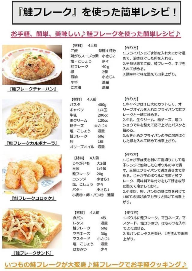 【原材料名】 さけ(国産、ロシア他)、大豆たんぱく、植物油脂(大豆を含む)、食塩、かつお節エキス、調味料(アミノ酸等)、着色料(黄5、赤102)