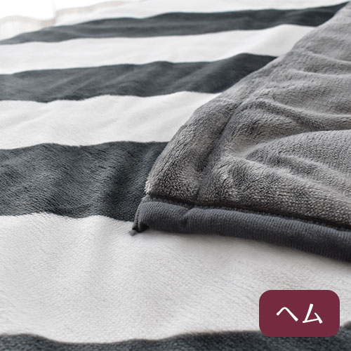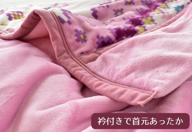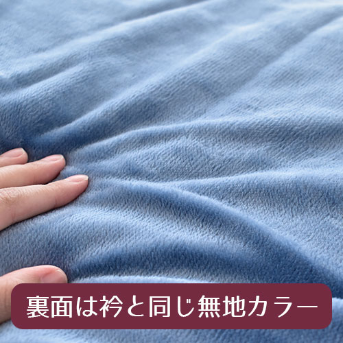 ふっくらとした衿付きで、首元までふんわりあったか。外から冷たい空気が入ってくるのを防ぎ、中の暖まった空気も逃しません。 毛布のフチはトリコットヘム加工で2枚合わせにした生地をしっかりと縫製しています。