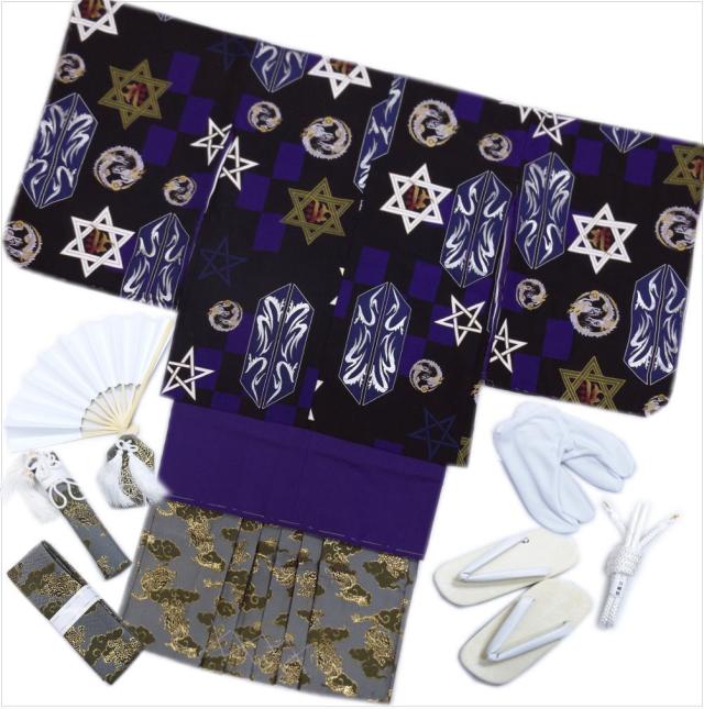 着物は濃紫地・羽織は黒地に背中には紫市松六角星龍輪の
