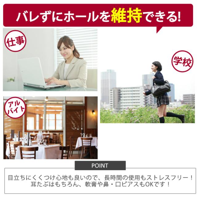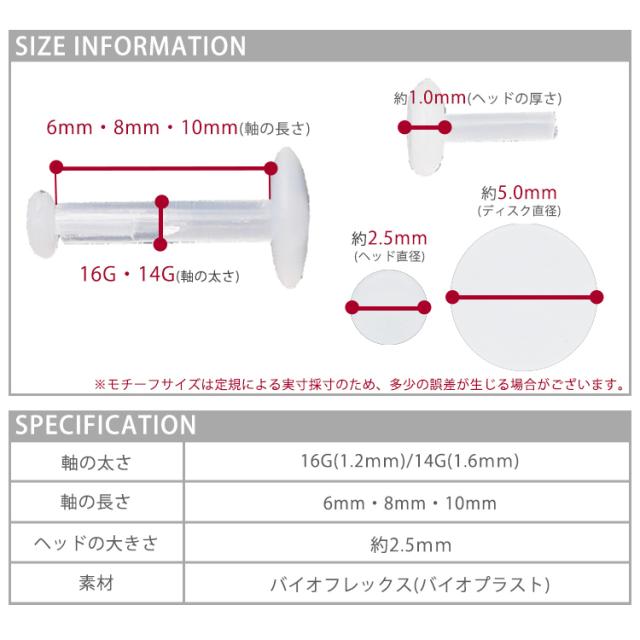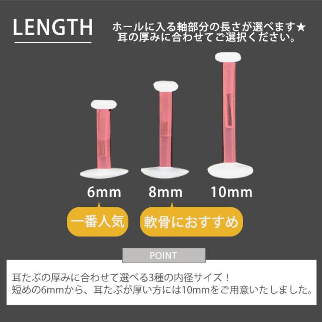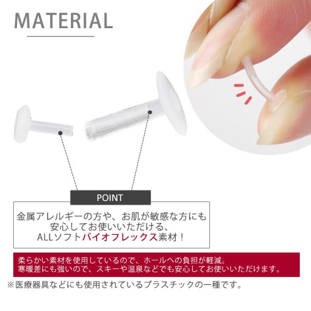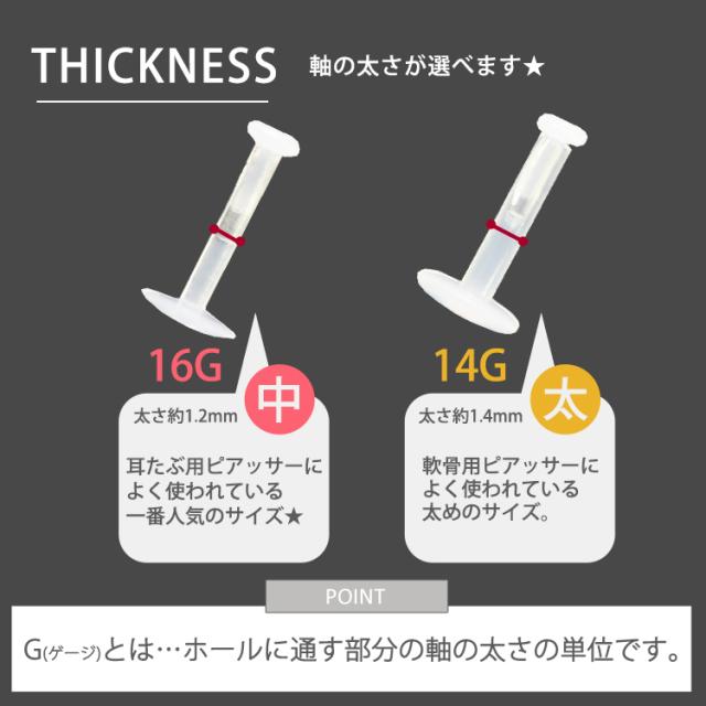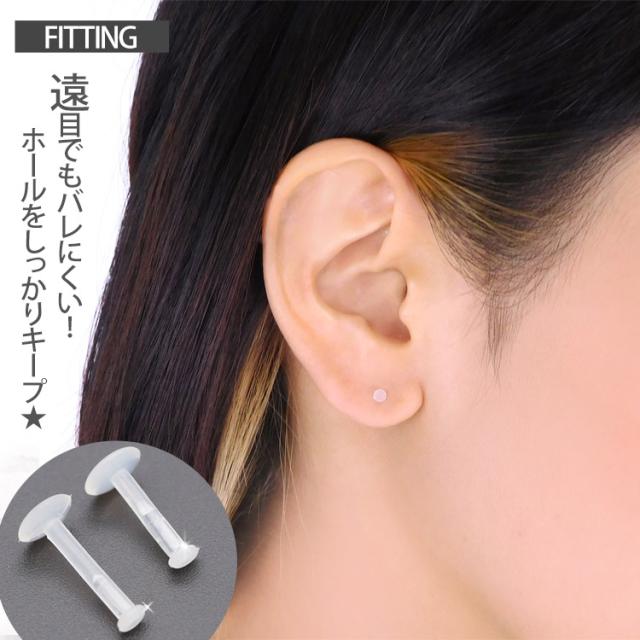 大切なホールを自然に隠すことが出来る人気のシークレットピアスです。ピンを差し込むだけの便利なプッシュピンスタイルなので、無くしがちなオーリングのキャッチも、ネジも必要ありません。脱着は「引き抜く」「差し込む」の動作で可能です。太さのサイズはボディピアスの定番サイズの16Gと14Gをご用意しております。耳たぶピアスはもちろん口ピアスや耳の軟骨ピアスにもお勧めです。太さのサイズ以外にも内径サイズ(長さ)がお選びいただけます。アレルギーフリーのバイオプラスト素材を使用しておりますので、金属アレルギーの方も安心してお使い頂けます。
