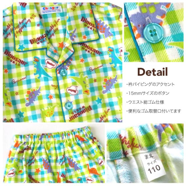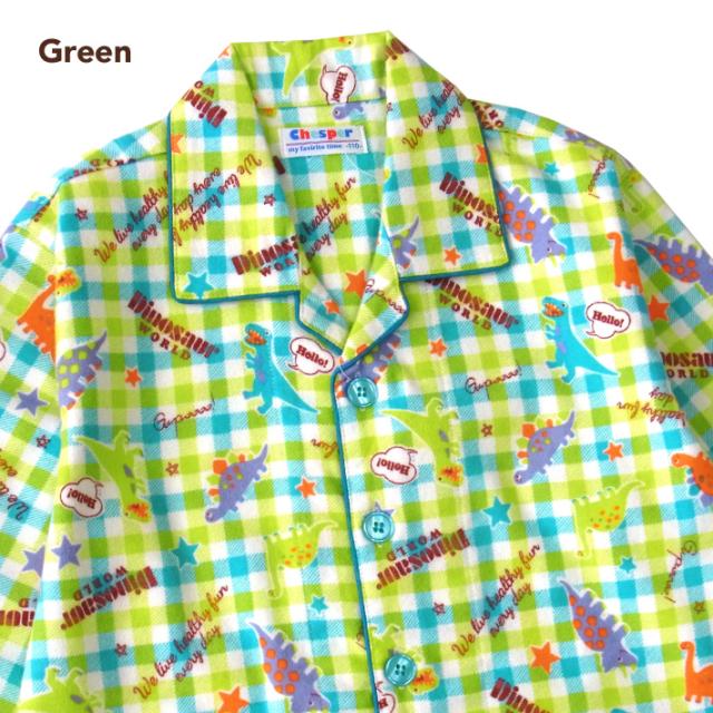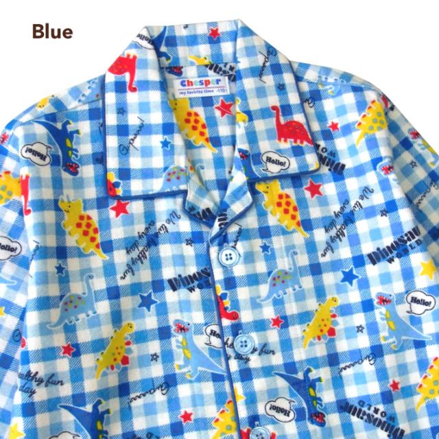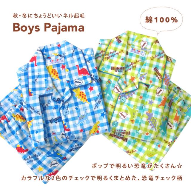パジャマ キッズ 男の子 綿100% 長袖 冬 前開き ボタン ネル起毛 恐竜チェック柄 ブルー グリーン 100 110 120 130 子供 ジュニア ボーイズ B269