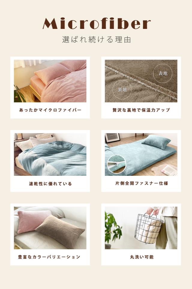 ふわっと暖かい極細繊維のマイクロファイバーカバーは、綿よりも吸水性が高く滑らかな肌触り!