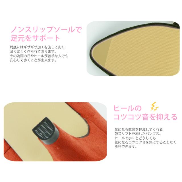 気になるヒールの靴音を軽減してくれる静音リフト、凹凸を施し滑りにくくしたノンスリップソールもポイント◎