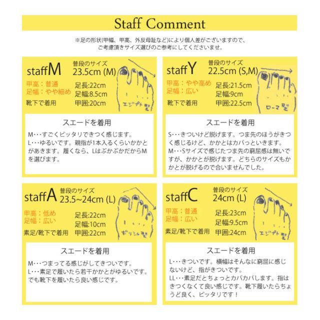 S:22.0〜22.5cm、M:23.0〜23.5cm、L:24.0〜24.5cm、LL:24.5〜25.0