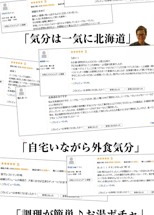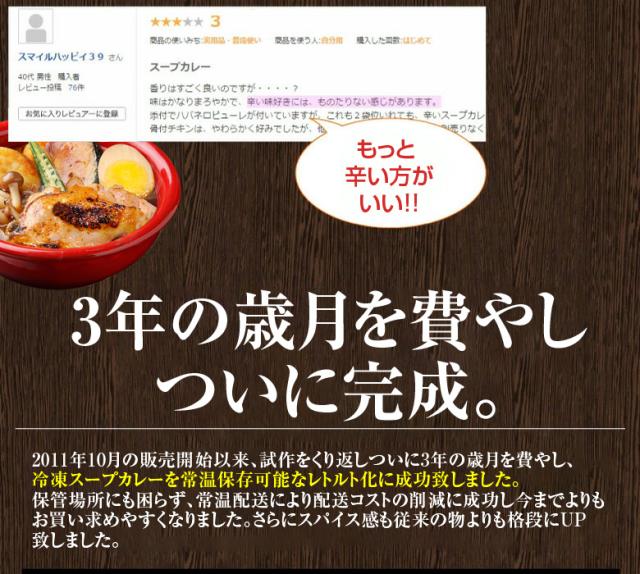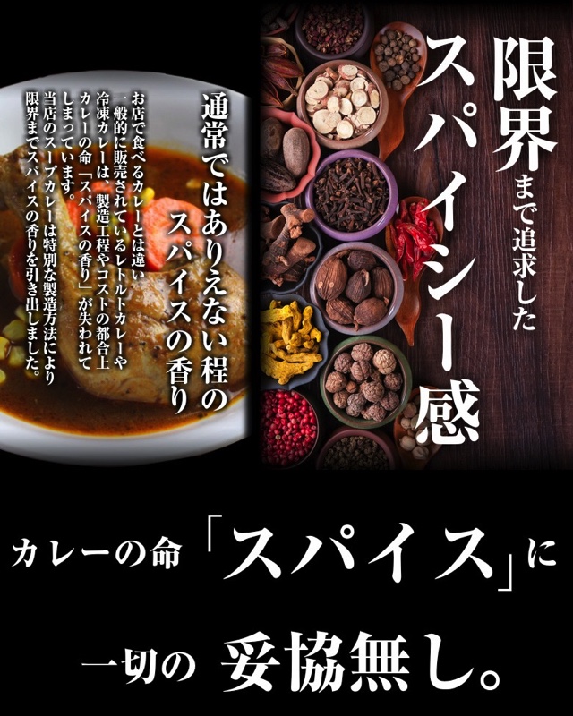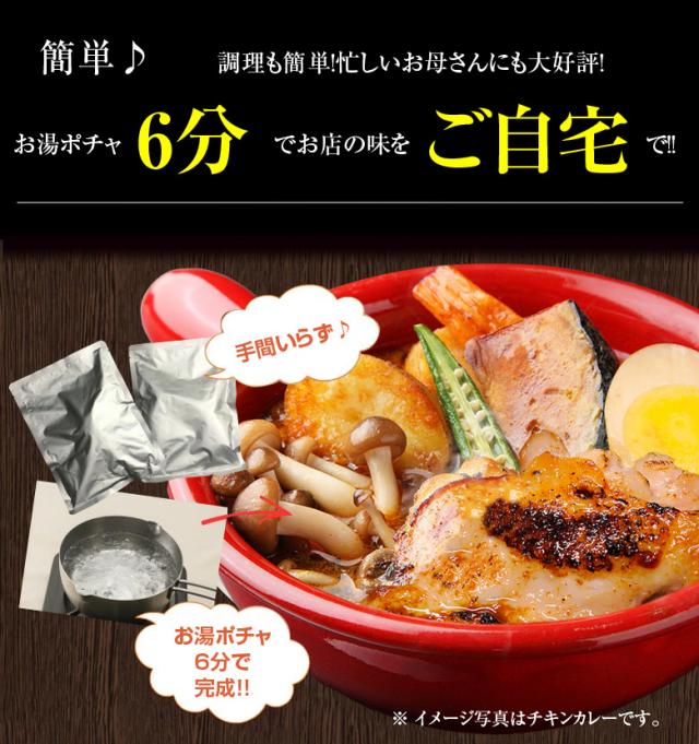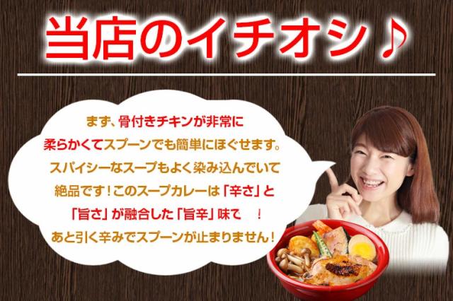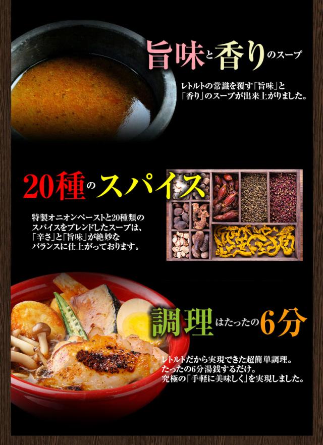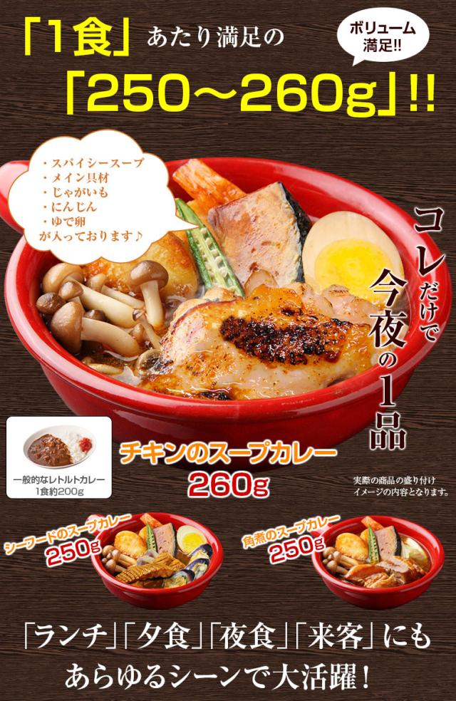| 商品詳細 | 全商品の中からランキング1位に選ばれた本格札幌スープカレー!通常のレトルトカレーでは出せないスパイスの香り!調理は簡単湯煎でお湯ポチャ6分!カレーうどん、業務用にもおすすめ! |