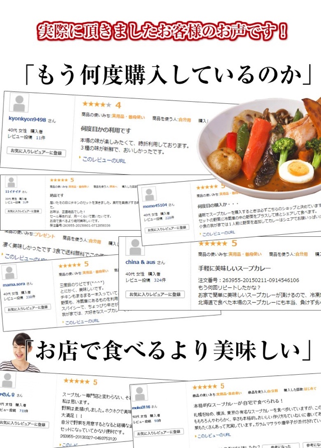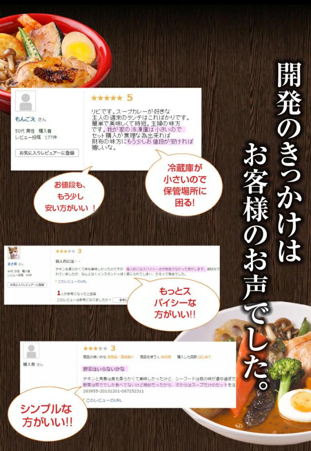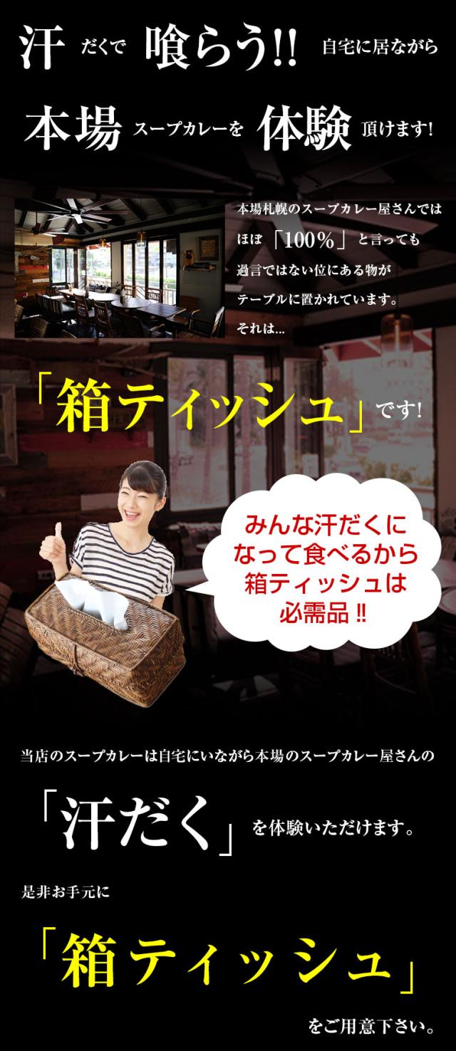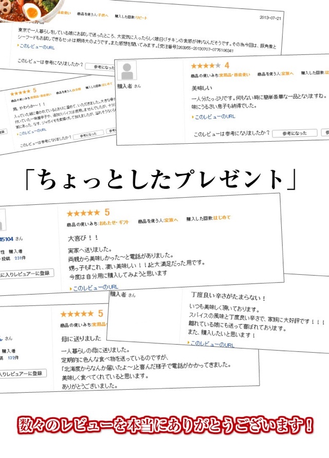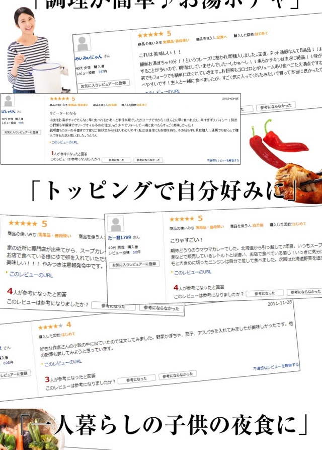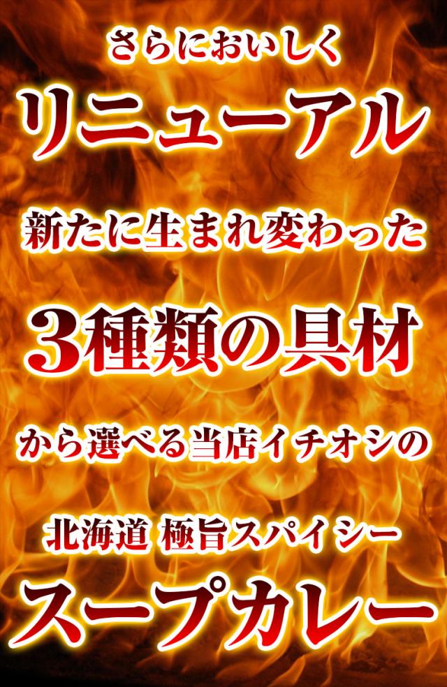 | 商品詳細 | 全商品の中からランキング1位に選ばれた本格札幌スープカレー!通常のレトルトカレーでは出せないスパイスの香り!調理は簡単湯煎でお湯ポチャ6分!カレーうどん、業務用にもおすすめ! |