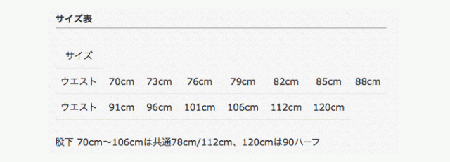 股下: 70cm〜106cmは共通78cm/112cm、120cmは90ハーフ