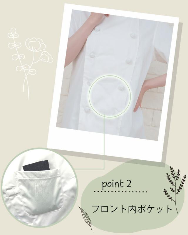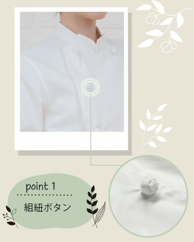 | 説明 特徴 | 飲食をはじめ、さまざまなシーンで活躍。 人気のロングセラー。綿100%の定番コックコート こだわりの組紐ボタン・便利なフロント内ポケット付き |