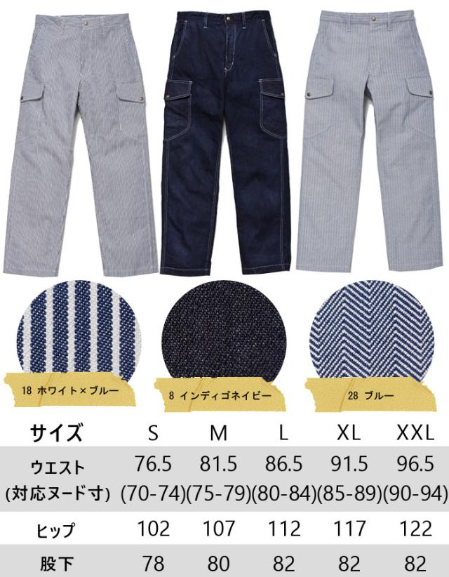 ■素材:8 インディゴネイビー:ストレッチデニム、18 ホワイト×ブルー:ストレッチヒッコリー、28 ブルー:ストレッチヘリンボーン