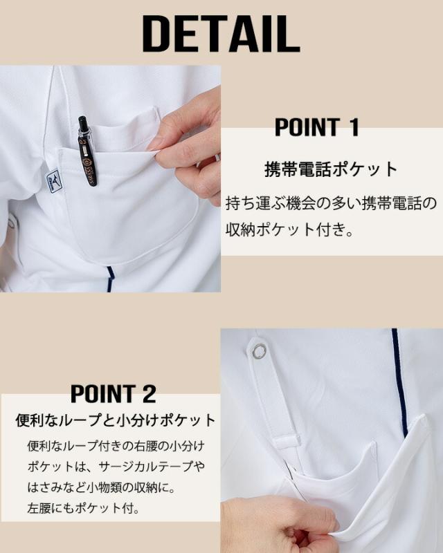 ■商品名:ケーシージャケット(女性用)■サイズ展開:S〜5L■カラー展開:ホワイト、ピンク、ネイビー■素材:トリコット■混率:ポリエステル100%■仕様:Dynamotion Fit、右胸ポケット(PHSポケット付)、両脇ポケット(右のみ中ポケット付)、右脇のみウエストループ付■機能:制菌、吸汗速乾、透防止、制電?Size Information S:肩幅 37cm/バスト 94cm/着丈 67cm/そで丈 21cm/ウエスト 80cmM:肩幅 38cm/バスト 98cm/着丈 68cm/そで丈 22cm/ウエスト 84cmL:肩幅 39cm/バスト 102cm/着丈 68cm/そで丈 23cm/ウエスト 88cmLL:肩幅 40cm/バスト 106cm/着丈 69cm/そで丈 24cm/ウエスト 92cm3L:肩幅 41.5cm/バスト 112cm/着丈 69cm/そで丈 24cm/ウエスト 98cm4L:肩幅 43.5cm/バスト 120cm/着丈 70cm/そで丈 24cm/ウエスト 106cm5L:肩幅 45.5cm/バスト 128cm/着丈 70cm/そで丈 24cm/ウエスト 114cm━━━━━━━━━━━━━━━━━━━━━実際の商品になるべく近い色を再現しておりますが、ご覧のモニター環境の違い等により、実際の商品と色味が若干異なる場合がございます。あらかじめご了承ください。また、刺繍加工後のサイズ交換、返品はお受けできません。ご注意ください。━...MIZU...