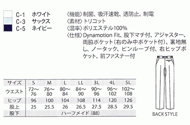 ■仕様:Dynamotion Fit、股下マチ付、アジャスター、両脇ポケット(右のみ中ポケット付)、裏地無し、ノータック、ピンループ付、右ヒップポケット、前ファスナー付
