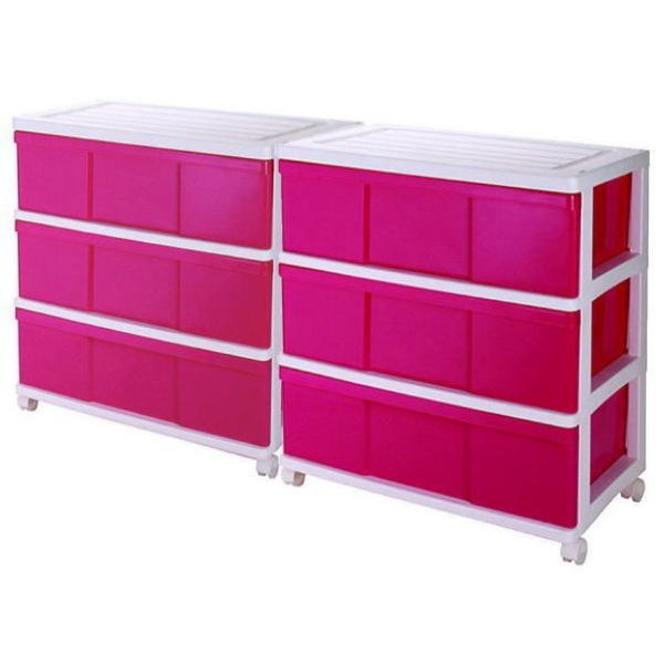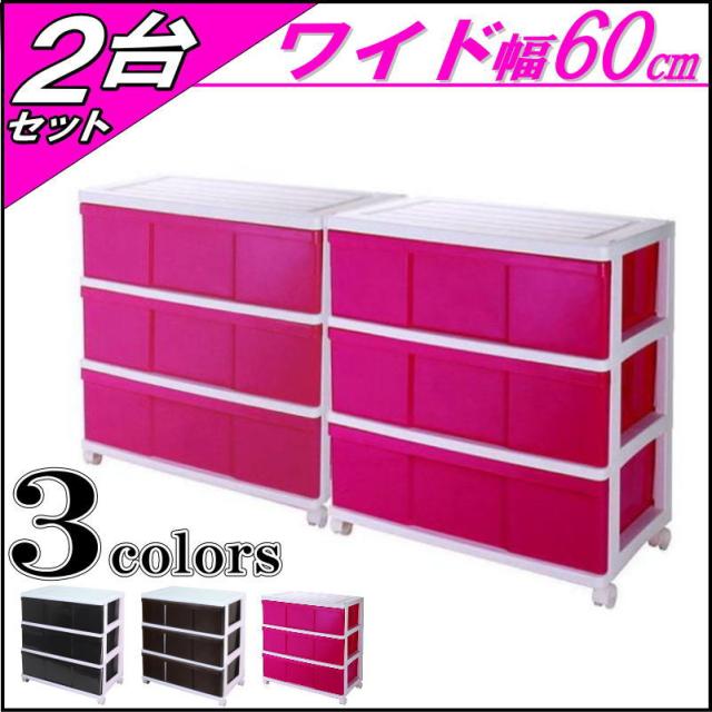 収納ボックス 収納ケース 引き出し ワイド チェスト プラスチック 3段 2個組 幅60cm おしゃれ ホワイト/ピンク 送料無料【自社製造】