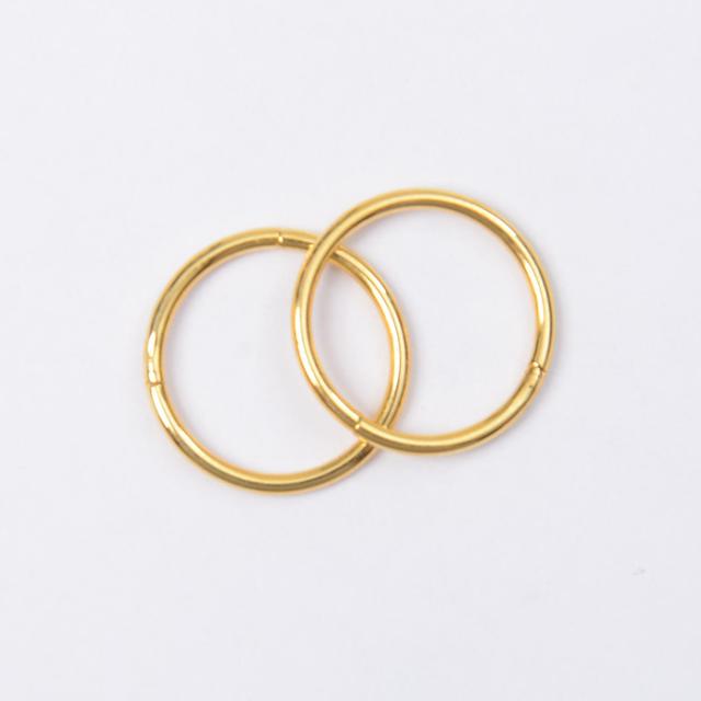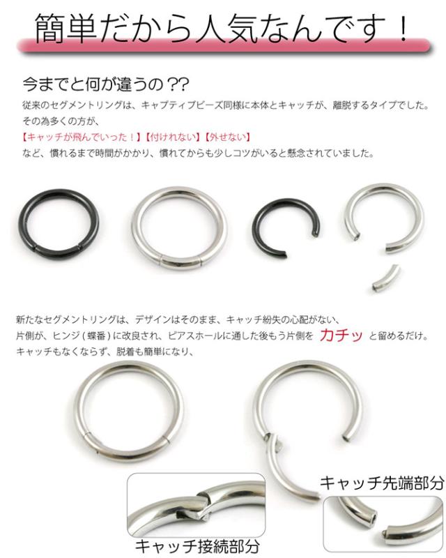 新たなセグメントリングは、デザインは、そのまま、キャッチ紛失の心配がない、片側がヒンジ(蝶番)に改良されピアスホールに通した後もう片側をカチッと留めるだけ。