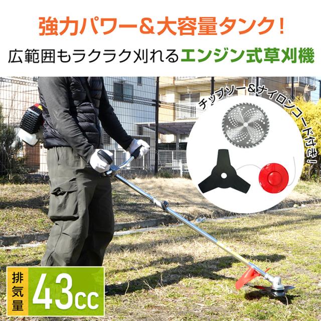 草刈り機 芝 エンジン 43cc ガソリンナイロン 刃 金属 チップソー 2枚付 工具付 ハンドル ストラップ 剪定 造園 空気冷却 zk113