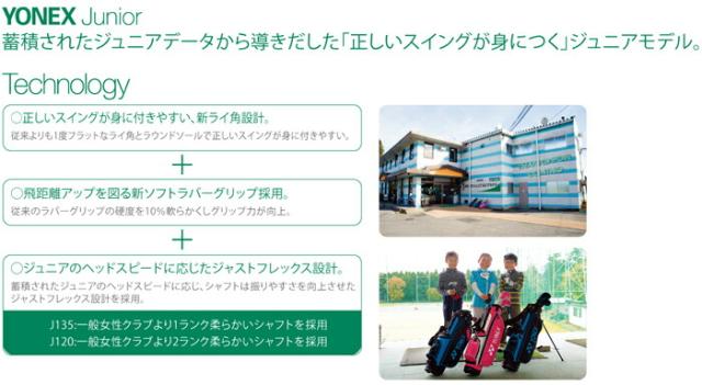【ヨネックスジュニアシリーズ】 ○従来よりも1度フラットなライ角とラウンドソールで、身長に合った 正しいスウィングプレーンを身につけやすい新ライ角設計といたしました。 ○従来のラバーグリップの硬度を10%軟らかくしてグリップ力を向上。 非力なジュニアゴルファーでもしっかり振れて飛ばせます。 ○ジュニアのスウィングスピードを調査し、サイズによってシャフトフレックスを変更し、 振りやすさを向上させた「ジャストフレックス設計」を採用しています。 |