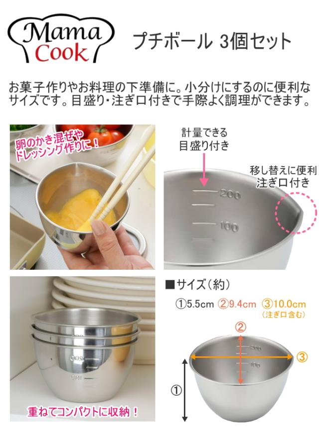ママクック プチボール 3個セット 35702 日本製 270ml 目盛 注ぎ口 ボウル ステンレス製 コンパクト 計量 小さい 小さめ 小分け 下準備 キッチン用品 キッチングッズ 容器 調理器具 料理 お菓子作り 製菓 ミニサイズ 下村企販