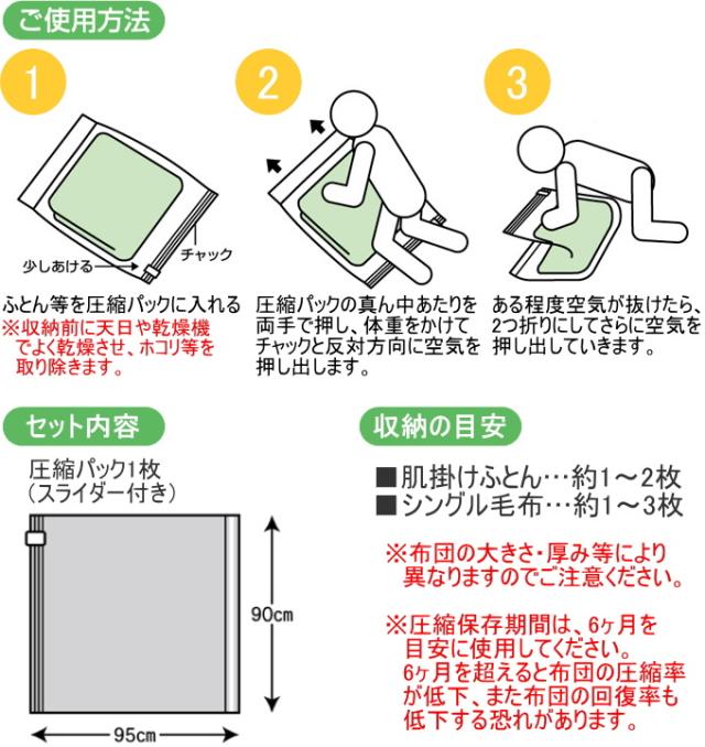 圧縮のめやすは、肌掛けふとんの場合で、圧縮前の厚みの約2分の1です。(圧縮率は、ふとん等の種類・使用状況により異なります。)