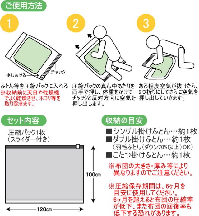 圧縮のめやすは、肌掛けふとんの場合で、圧縮前の厚みの約2分の1です。(圧縮率は、ふとん等の種類・使用状況により異なります。)