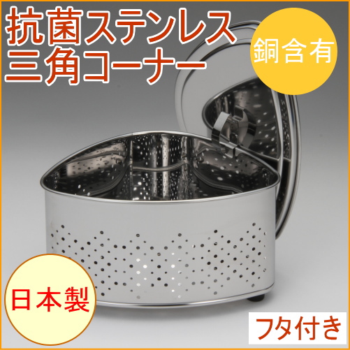 抗菌ステンレス 三角コーナー 蓋付き (CK-114) 銅イオン抗菌 日本製 キッチン おしゃれ フタつき