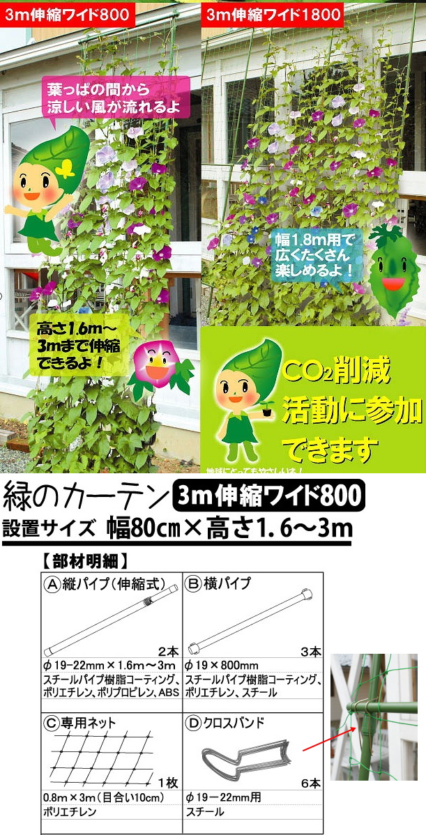 伸縮式緑のカーテン 3m ワイド800 立掛けタイプ 園芸 ガーデニング 家庭菜園 庭 グリーンカーテン 緑のカーテン