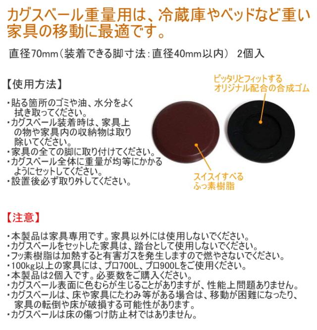 | 使用上の注意 | 本製品は家具専用です。家具以外には使用しないでください。 カグスベールをセットした家具などは、踏み台として使用しないでください。 燃やさないでください。(加熱しないでください。) カグスベールは床の傷つけ防止材ではありません。 床用樹脂仕上剤の拭き残しがある場合や、ホコリや砂などが付着している状態でカグスベールを動かすと床に傷が付く可能性があります。 100kg以上の家具には、プロ700L、プロ900Lをご使用ください。 本製品は2個入です。家具の脚数に応じて、必要数をご購入ください。 カグスベール表面に色むらが生じることがありますが、性能上問題ありません。 |