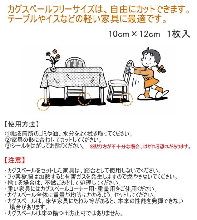 | 使用上の注意 | 家具などの移動以外には使用しないでください。 カグスベールをセットした家具などは、踏み台として使用しないでください。 燃やさないでください。(加熱しないでください。) カグスベールは床の傷つけ防止材ではありません。 捨てる場合は不燃ゴミとして処理してください。 カグスベール全体に重量が均等にかかるようにセットしてください。 カグスベールは床や家具にたわみなどがあると、本来の性能を発揮できない場合があります。 重い家具にはカグスベール重量用・コーナー用をご使用ください。 |