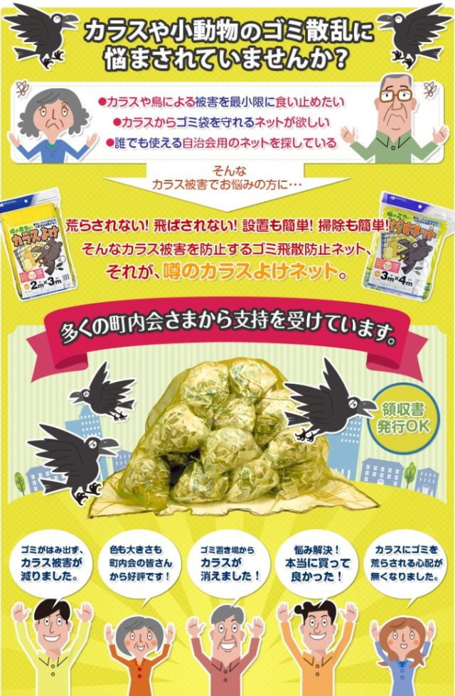カラスや鳥による被害を最小限に食い止めたい方、カラスからゴミ袋を守れるネットをお探しの方、誰でも扱える自治体向け(町内会、自治会他)ゴミ袋ネットをお探しの方にとっても便利なアイテムです。