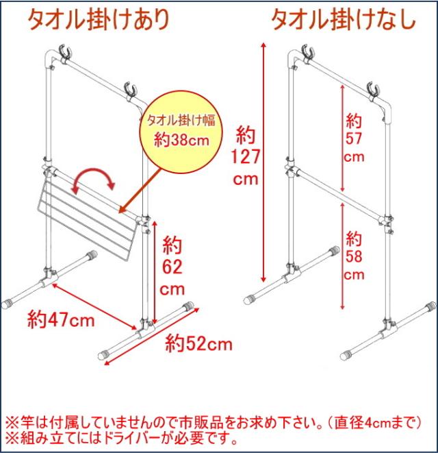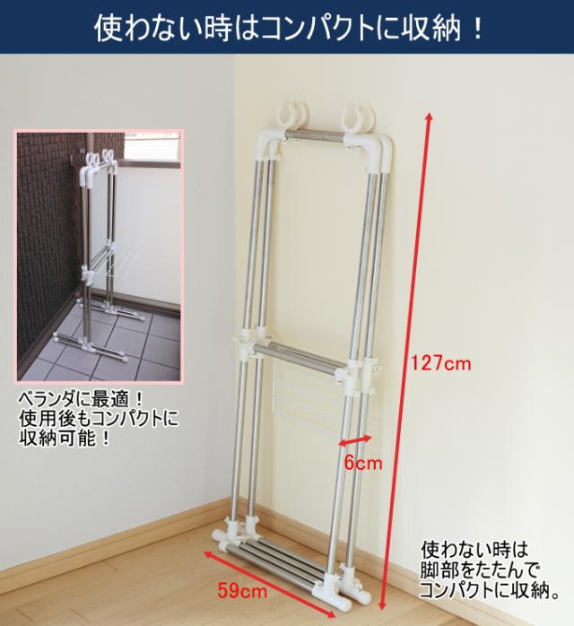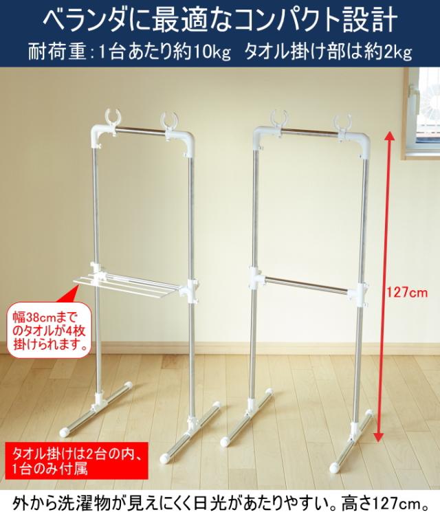 ベランダに最適なコンパクト設計。外から洗濯物が見えにくい。日光があたりやすい。 使わない時は脚部をたたんでコンパクトに収納できる。 幅38cmまでのタオルが4枚干せる。 便利なタオル掛け付き。(2台のうち1台に附属) 布団も干せる。 ※竿は附属致しませんので市販品をお求め下さい。(直径4cmまで) 組み立てにはドライバーが必要です。 |