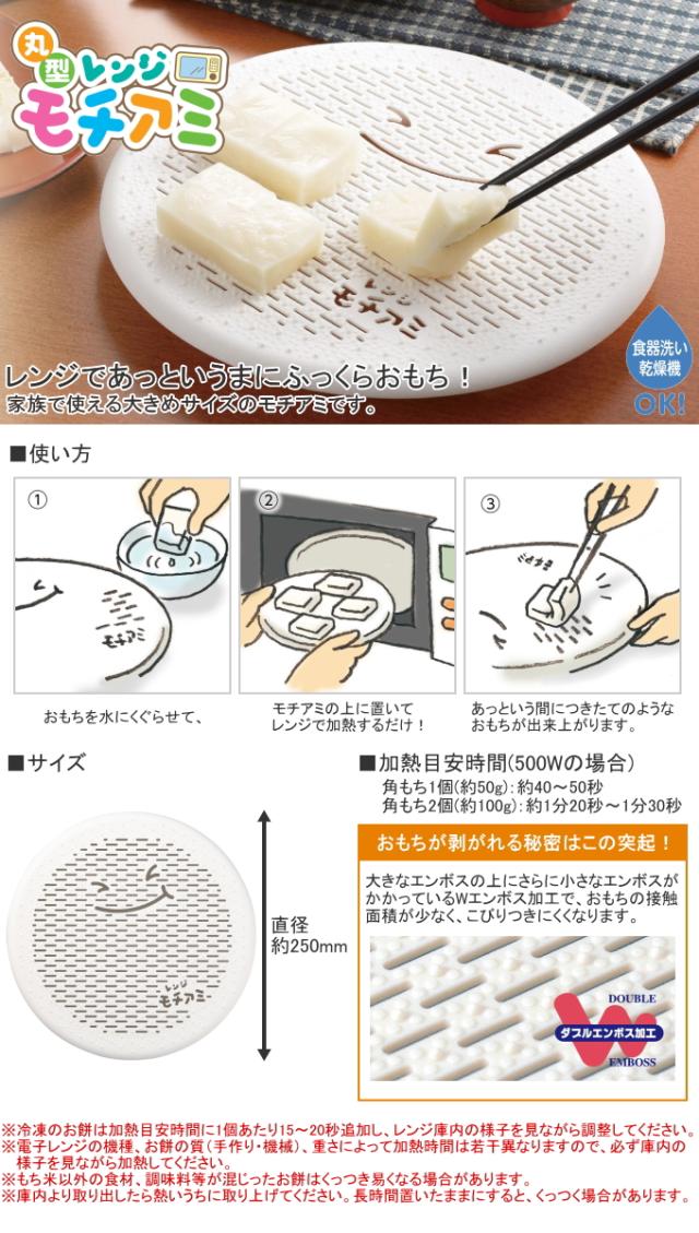 | 特徴 | 電子レンジであっという間にふっくらおもち! 特許技術のダブルエンボス加工でおもちがくっつきにくい。 おもちを水にくぐらせて電子レンジで加熱するだけで簡単に出来上がります。 ファミリーサイズの大きなモチアミです。 食器洗い乾燥機対応。 ※冷凍のお餅は加熱目安時間に1個あたり15〜20秒追加し、レンジ庫内の様子を見ながら調整してください。 |