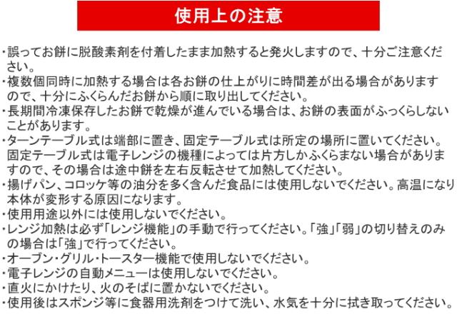 ・電子レンジの機種、お餅の質(手作り・機械)、重さによって加熱時間は若干異なりますので、必ず庫内の様子を見ながら加熱してください。 ・もち米以外の食材、調味料等が混じったお餅はくっつき易くなる場合があります。 ・複数個同時に加熱する場合は各お餅の仕上がりに時間差が出る場合がありますので、十分にふくらんだお餅から順に取り出してください。 ・庫内より取り出したら熱いうちに取り上げてください。長時間置いたままにすると、くっつく場合があります。 ・長期間冷凍保存したお餅で乾燥が進んでいる場合は、お餅の表面がふっくらしないことがあります。 ・誤ってお餅に脱酸素剤を付着したまま加熱すると発火しますので十分ご注意ください。 ・ターンテーブル式は端部に置き、固定テーブル式は所定の場所に置いてください。固定テーブル式は電子レンジの機種によっては片方しかふくらまない場合がありますので、その場合は途中餅を左右反転させて加熱してください。 ・揚げパン、コロッケ等の油分を多く含んだ食品には使用しないでください。 ・使用用途以外には使用しないでください。 ・レンジ加熱は必ず「レンジ機能」の手動で行ってください。「強」「弱」の切り替えのみの場合は「強」で行ってください。 ・オーブン・グリル・トースター機能で使用しないでください。 ・電子レンジの自動メニューは使用しないでください。 ・直火にかけたり、火のそばに置かないでください。 ・使用後はスポンジ等に食器用洗剤をつけて洗い、水気を十分に拭き取ってください。 |