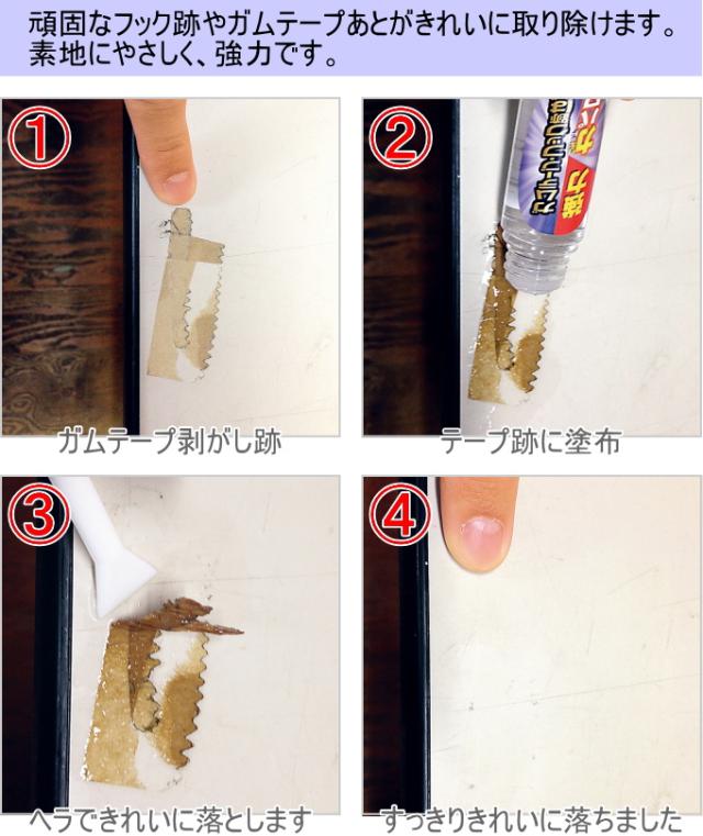 一般用のはがし駅では落ちず、あきらめていた頑固なテープ跡や強力粘着剤の除去に威力を発揮します。