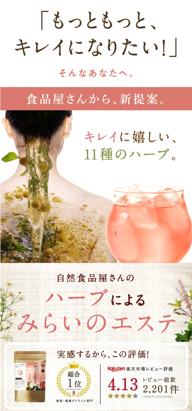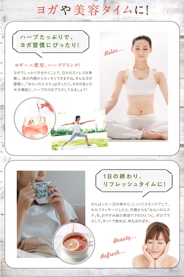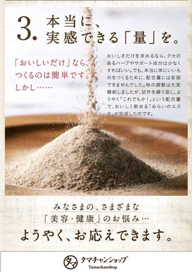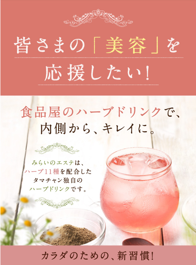 - 待ちに待って届いたみらいのエステ、到着してから毎日一杯は飲むようにしています。ゆっくりお風呂に浸かれる時は入る前と後に一杯ずつ、少しでも体の中が綺麗になるようにと飲んでいます。 ホットでもアイスでもお...