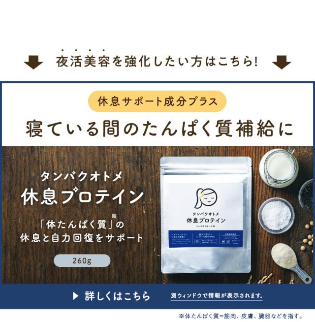 - 50代になり、更年期障害が酷くダイエット目的ではなく内容成分や寝ている間に補給できると言うことで購入しました。プロテインというと、朝に飲んでいましたが、休息プロテインは夜で良くて、時間が経つと満腹感が...