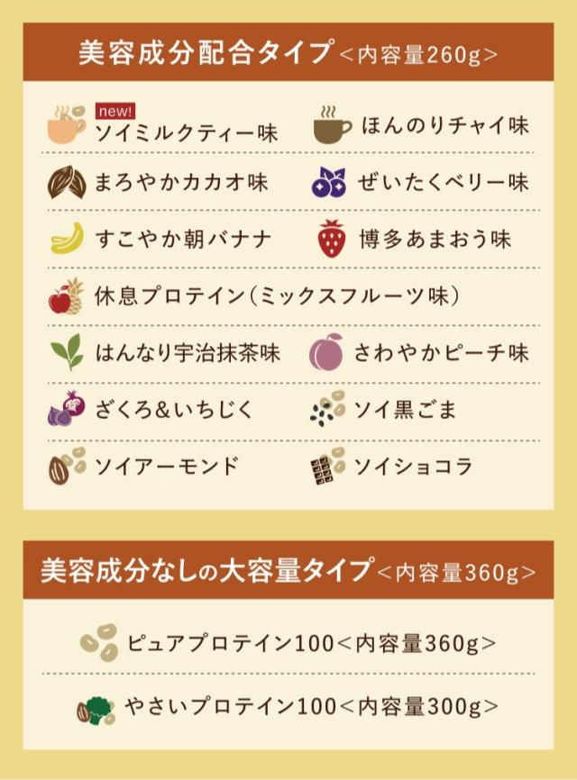 [内容量]チャイ/ベリー/カカオタイプ/春バニラ/バナナ/休息プロテイン(ミックスフルーツ、夜風のココア)/博多あまおう/チョコミント /さわやかピーチ/春バニラ/宇治抹茶/ざくろ&イチジク/ソイアーモンド/ソイ黒ごま/ソイショコラ/ソイミルクティー 260g、やさいプロテイン100 300gピュアプロテイン100 360g