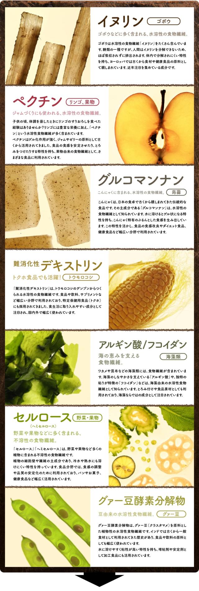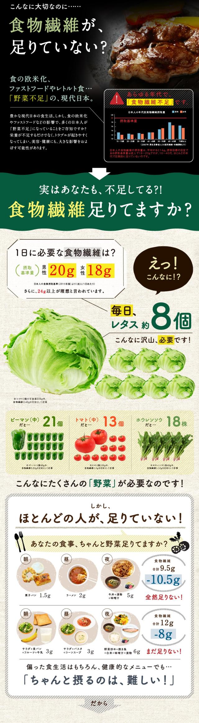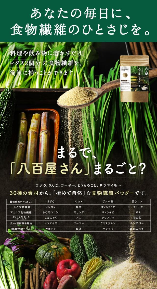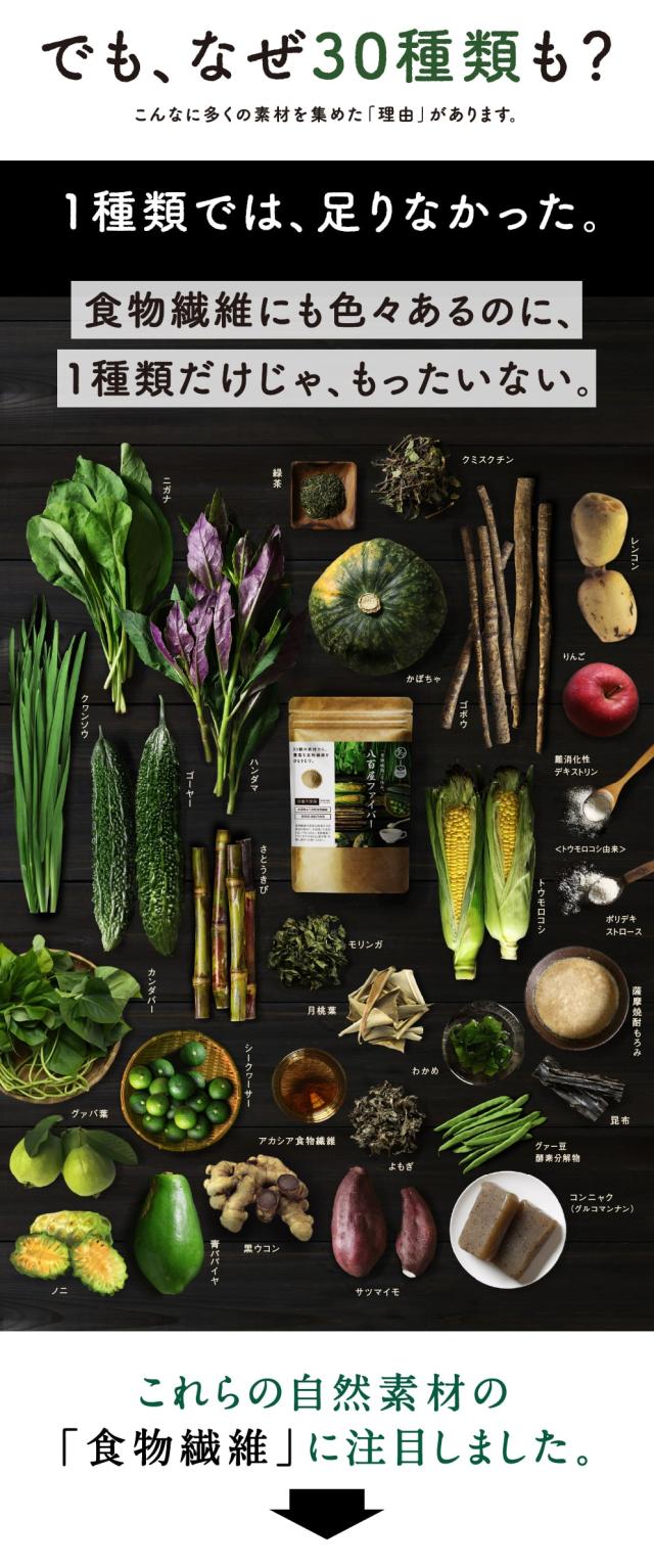 [原材料]水溶性食物繊維、アカシア食物繊維、りんご繊維、ポリデキストロース、グァー豆酵素分解物、こんにゃく粉、野菜ミックス粉(クヮンソウ、さとうきびバガス、カンダバー、青パパイヤ、グァバ葉、クミスクチン、月桃葉、ゴーヤー、シークヮーサー、ニガナ、ノニ葉、ハンダマ、モリンガ、緑茶、黒ウコン、ヨモギ)、トウモロコシ粉末、レンコン粉末、かぼちゃ粉末、サツマイモ粉末、ゴボウ粉末、わかめ粉末、昆布粉末、薩摩焼酎もろみ末