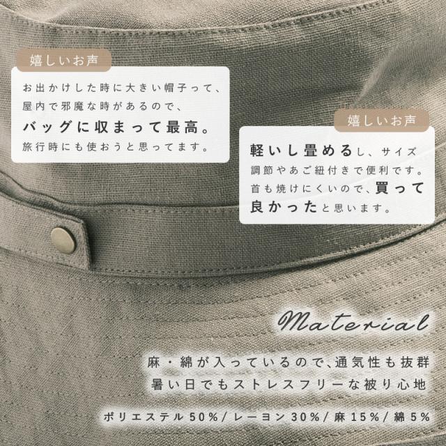 - 旅行用に購入しました。ツバも広く、軽くて折りたためてとても良かったです。アジャスターが着いているので、海風にも飛ばなくて便利でした。被ると涼しくて日差しもしっかり遮る事ができました。