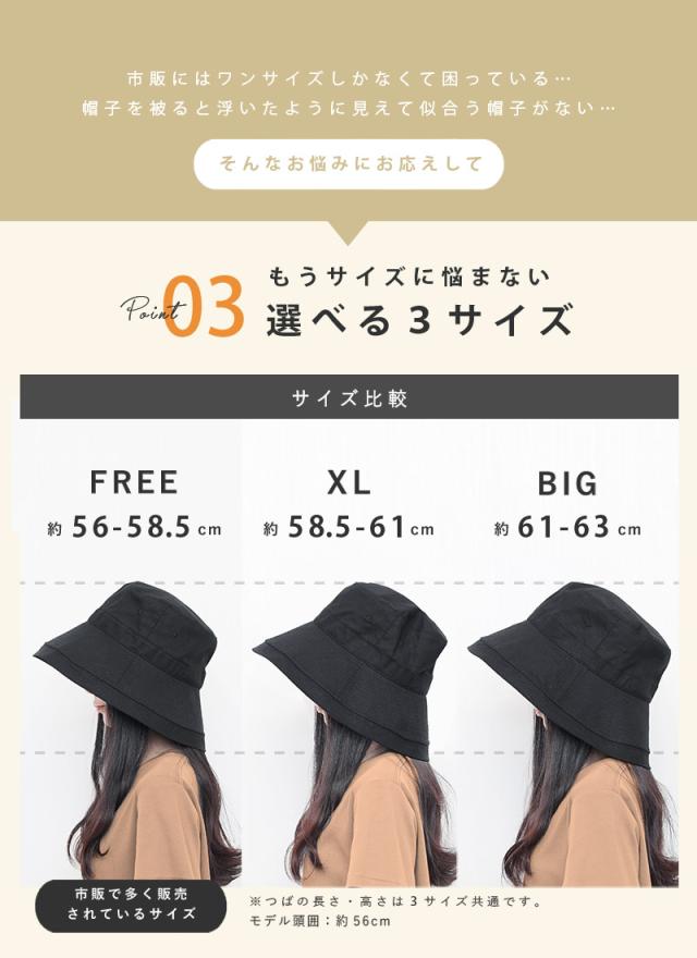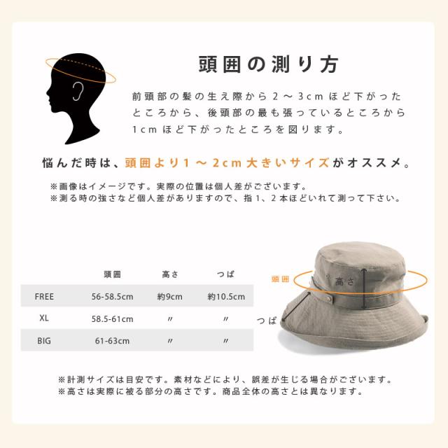 | ※高さの表記が同じ場合、デザインや形により被り心地、印象が異なります。着用時の高さを記載致しております。 (平置き)との記載がある場合、素材が柔らかい、伸縮性等の理由から、平置きでの計測サイズを記載致しておりますので、ご確認下さいませ。 モデル(頭回り 約57cm) 着用サイズ、 フリーサイズ(56-58.5cm) | |||
