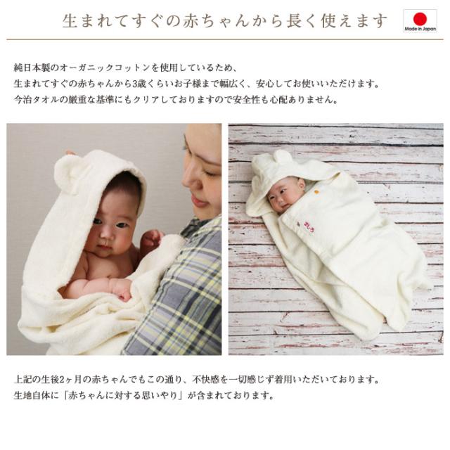 - 7ヶ月の子どもがいる友人にプレゼントしました。最近お風呂上がりに動き回って大変なので助かる、フードが便利、そして可愛い!と喜んでもらえました。写真を見せてもらいましたが、名前の刺繍も可愛かったです。