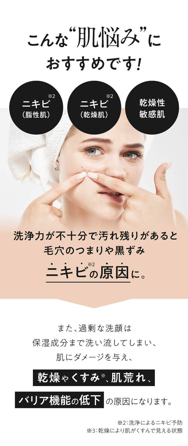 | 使用方法 | *ピーリング後は当日よりご使用いただけます。 顔を湿らしたあと、清潔な手に適量(3〜4プッシュ)を取り、泡で包み込むようにやさしく洗顔し、その後よくすすぎます。 *日焼け止めやメイクをしている場合は、メイク落としを使用したのちお使いください。 ファンデーションなどが肌に残っていると、泡もちが悪くなる場合があります。 *使いはじめは中身が出るまでポンプをゆっくり数回押してください。 |