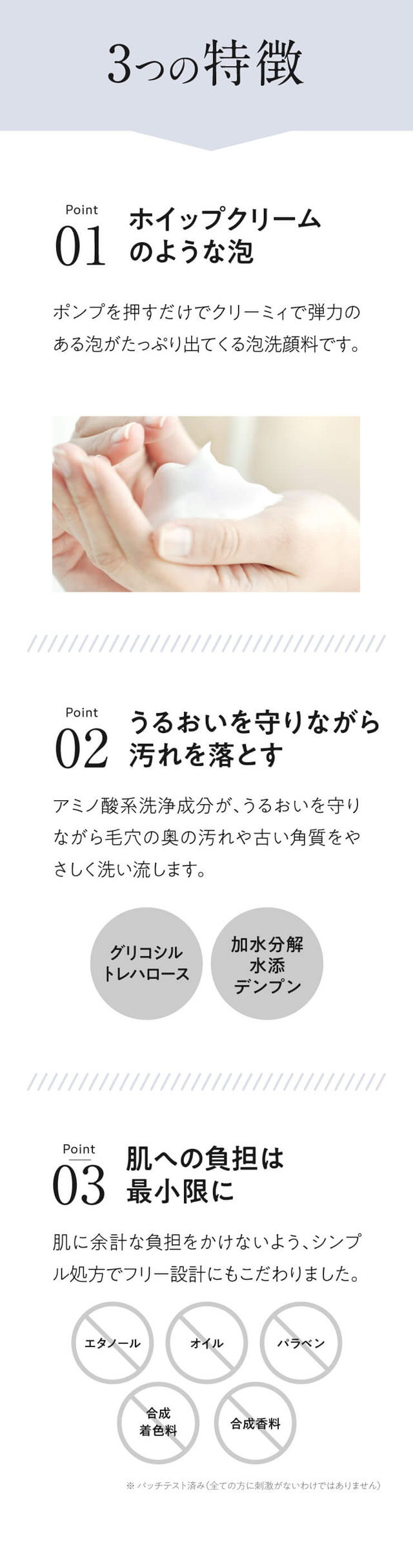 汚れはしっかり落とすのに、肌のうるおいはうばわない、低刺激で肌にやさしいアミノ酸系洗浄成分使用。ポンプを押すだけでホイップクリームのような泡がたっぷり出てくる泡洗顔料です。クリーミィで弾力のある泡が、摩擦による刺激から肌を守りながら汚れをやさしく落とします。