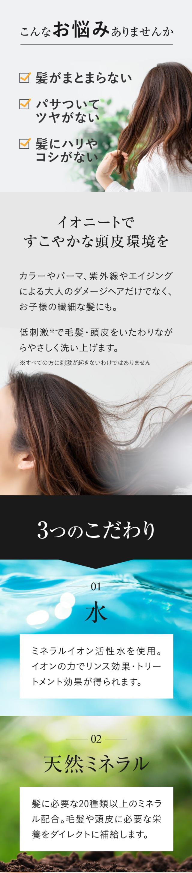 髪や頭皮をいたわりながらやさしく洗い上げ、イオンの力でリンス効果・トリートメント効果がえられます。