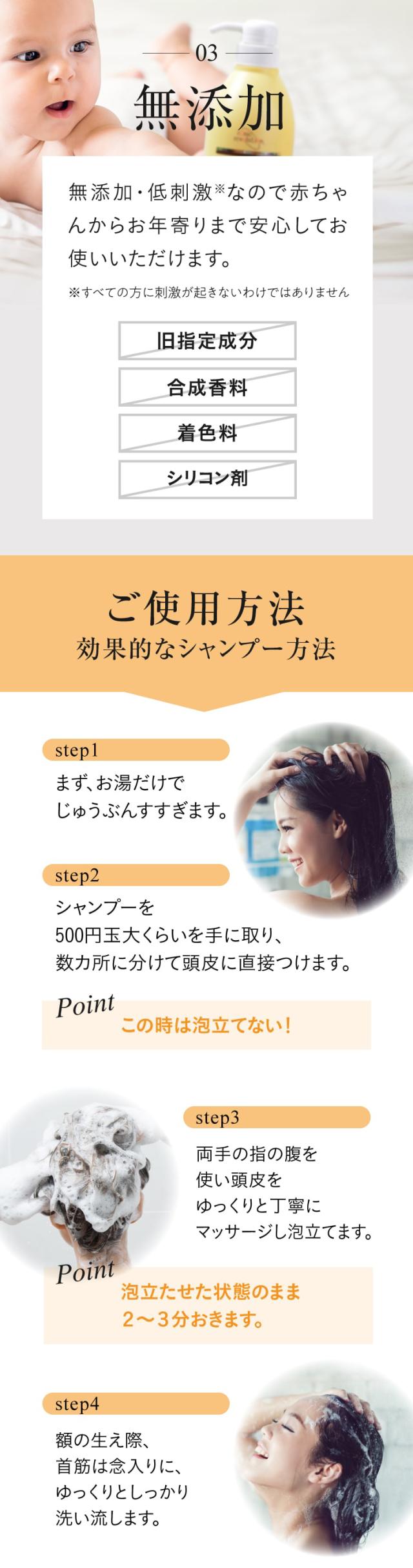 | ご使用方法 | 1.お湯で頭皮を十分にすすぎ、シャンプーを500円玉位手にとり、泡立てずに頭皮に直接、数か所に分けてつけていきます。 2.両手の指の腹をつかって、頭皮をゆっくりとていねいにマッサージし、泡立てます。 3.すぐに洗い流さず、2〜3分程度そのまま放置します。 (植物エキスによる分解作用・糖類エキスによるリンス効果を高めます。) 4.完全に洗い流します。とくに額の生え際、首筋は念入りに3分程度ゆっくり洗い流します。 |
