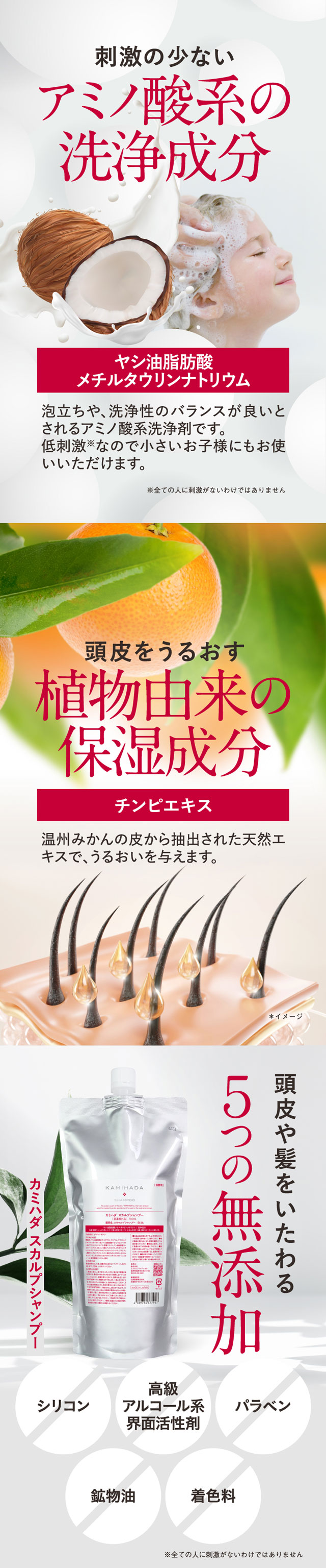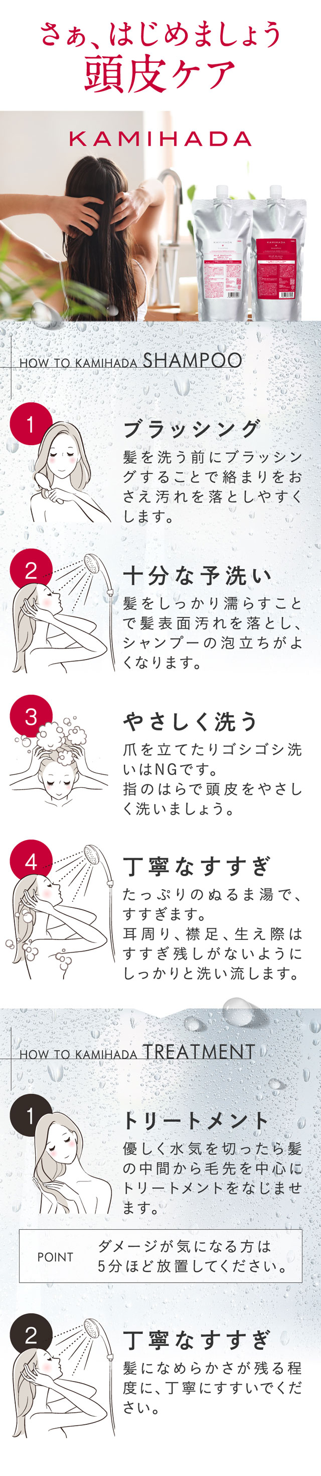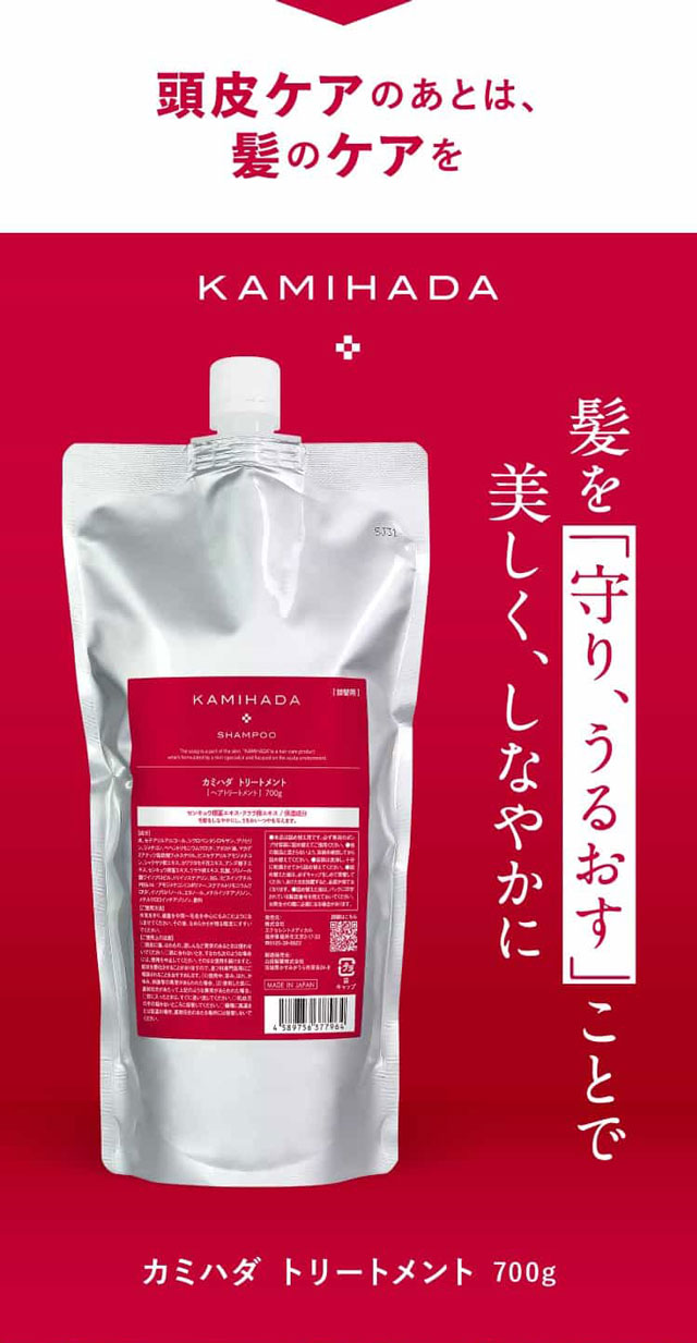 | 特徴 | 皮膚の専門家 監修により作られたヘアケアブランド『KAMIHADA(カミハダ)』 【スカルプシャンプー】 すこやかな頭皮環境へ導くノンシリコンシャンプー。 頭皮への負担を考えたアミノ酸系洗浄料を採用。 さらに頭皮ケアにこだわった有効成分「ピロクトンオラミン」がフケ・かゆみを防ぎ、保湿成分「チンピエキス」がすこやかでうるおいのある頭皮へ導きます。 【トリートメント】 しっかりと保湿成分を届け、しなやかでハリのある美しい髪に導くトリートメント。 髪の内部にしっかりと保湿成分を届け、しなやかでハリのある美しい髪へ導きます。また、不要なものを洗い落とし無防備になった髪を必要最低限のコーティングで整えサポートします。 ●植物由来の保湿成分 マカデミアナッツ脂肪酸フィトステリル、アボカド油、シャクヤク根エキス、カワラヨモギエキス、アンズ種子エキス、センキュウエキス、クララエキス |